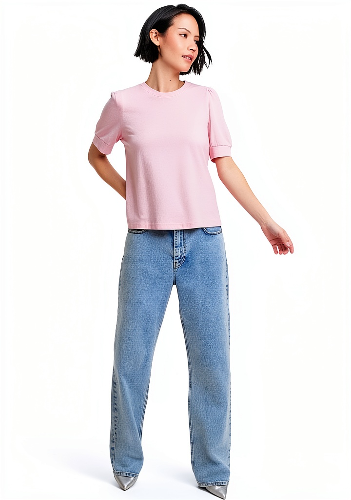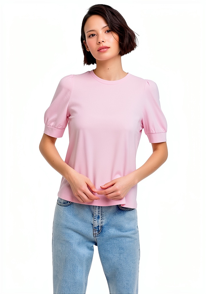 Ideale per occasioni informali come uscite quotidiane, appuntamenti o tempo libero, questa maglietta si abbina facilmente a jeans, gonne o pantaloni. Il suo design semplice e le maniche a sbuffo la rendono adatta per donne che cercano un capo comodo ma elegante, perfetto per la primavera e l’estate.